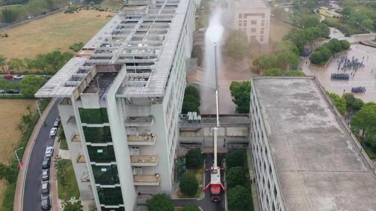 本网讯 9月14日,学校军训工作领导小组成员单位组织2022级新生在南北校区同步开展疏散逃生演练,经开区消防救援大队徽园消防站出动62米高喷消防车配合疏散演练。