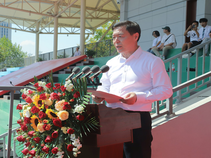 本网讯 朗朗金秋,朝阳初上,崭新的晨光,迎来了全新的开端。9月16日上午,学校2022级新生军训成果展示暨开学典礼在南校区田径场举行。校领导孙道胜、黄显怀、蔡新立、王玉兰、闵杰、蔡国军、李早及承训部队负责人出席典礼。学校职能部门主要负责人,各学院党委书记、院长、副书记、优秀校友代表、全体新生辅导员及2022级全体新生参加典礼。典礼由校党委常委、副校长蔡新立主持。
